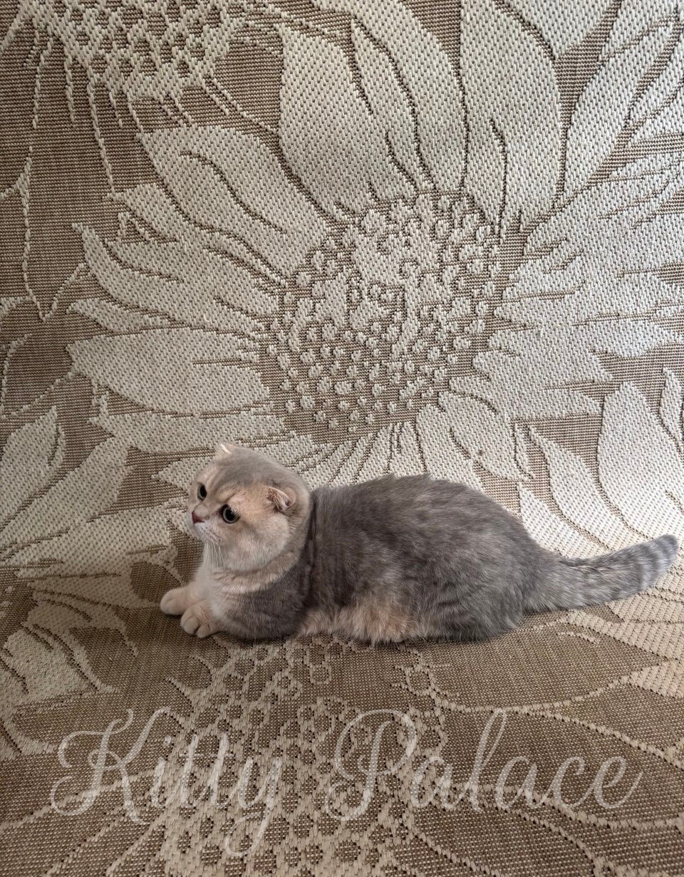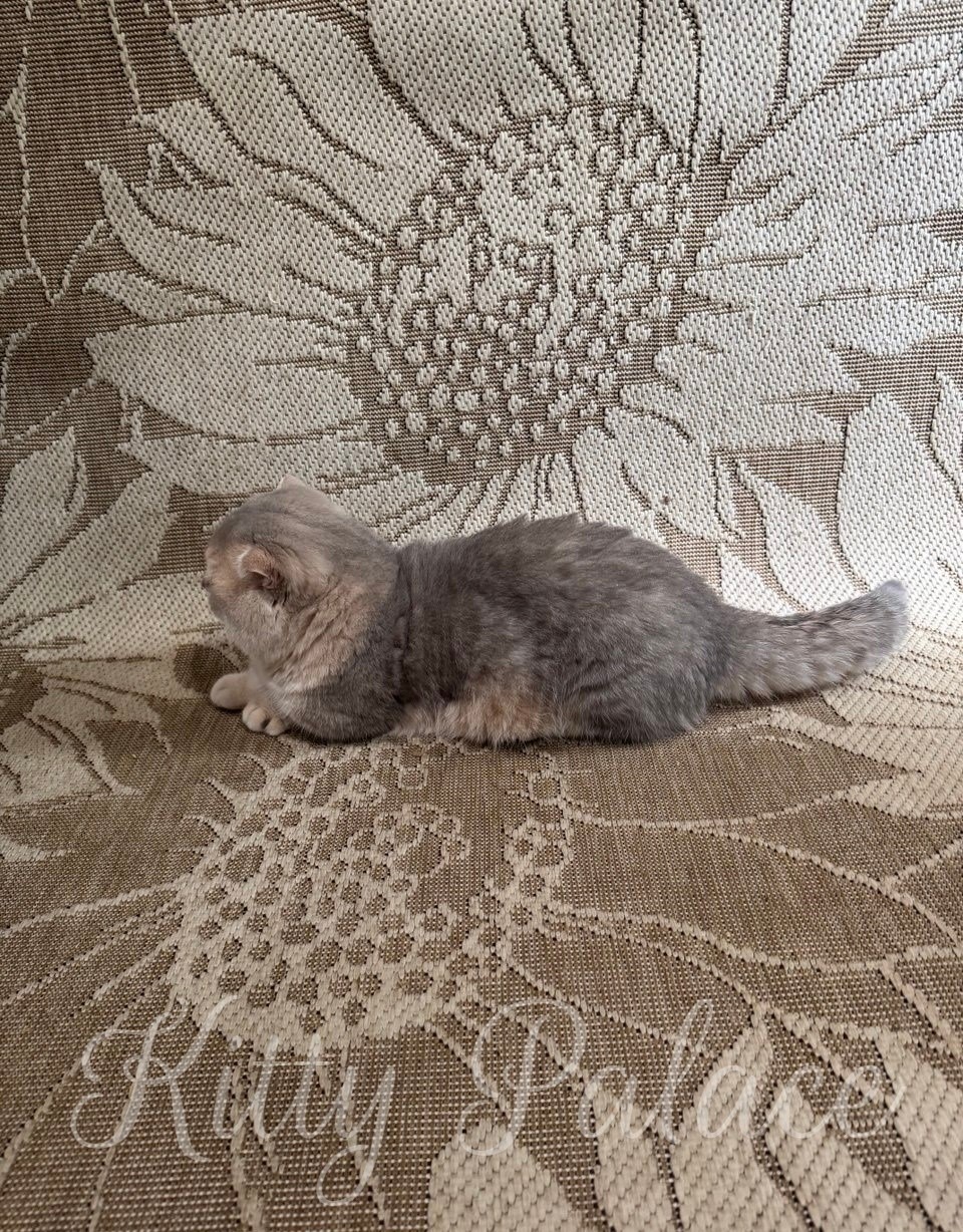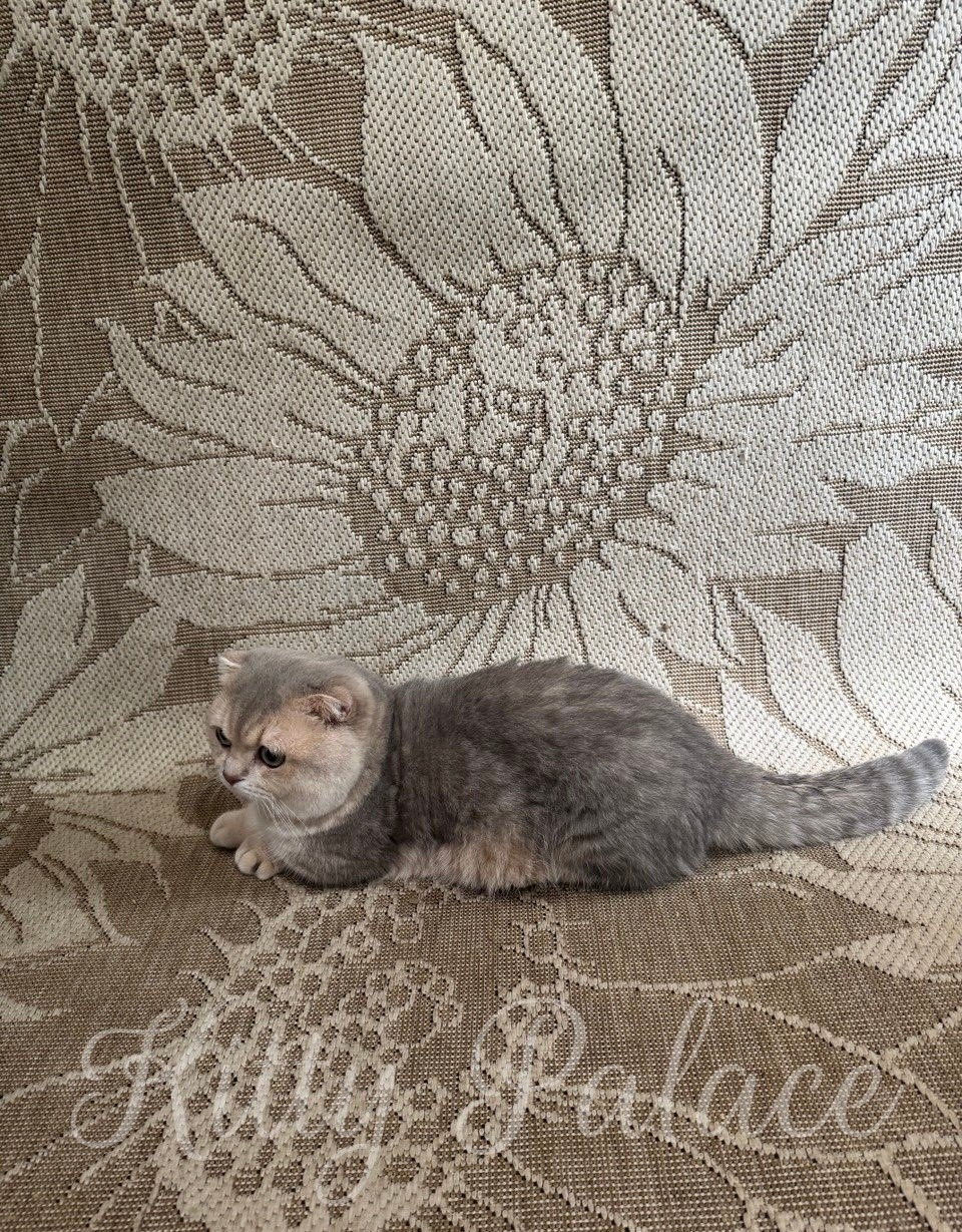 Clever’s blue golden spotted fur glows beautifully under natural light, giving him a warm and sunny appearance. In addition, his folded ears and round face add to his unique charm, creating an irresistibly sweet look. Moreover, his short legs and cat-sized energy make him both fun to watch and lovely to hold. He often follows his humans with quiet devotion, always curious but never disruptive.